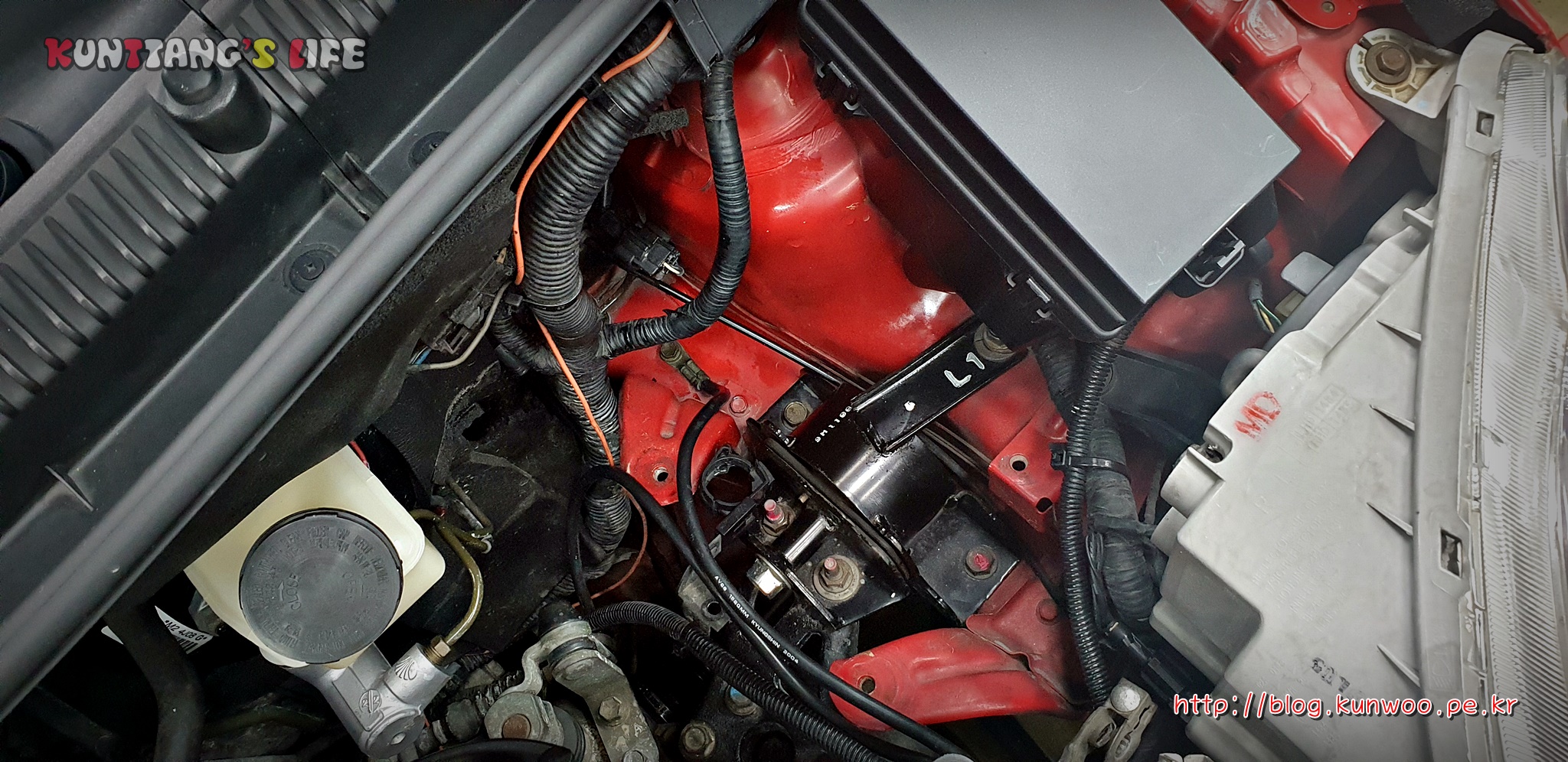 정면에서 엔진룸을 보았을 때, 왼쪽부분은 개조를 하지 않았기 때문에 기존 대를 설치하는 홀에 걸으면 된다. 하지만 오른쪽 대의 고정 위치가 참으로 애매하다. 필자는 미션마운트에 걸쳤다.