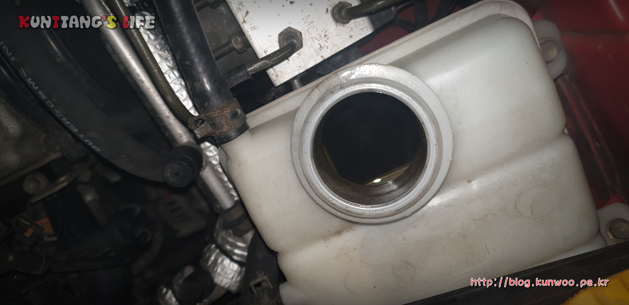파워스티어링 오일의 상태도 확인해 보았다. 생각보다 나쁘진 않았다. 빨간색 파워스티어링 오일 색상이 선명하진 않지만, 많이 지저분 하지는 않다. 이 부분은 집에 여분의 파워스티어링 오일이 있기 때문에 조만간 교환할 예정이다.